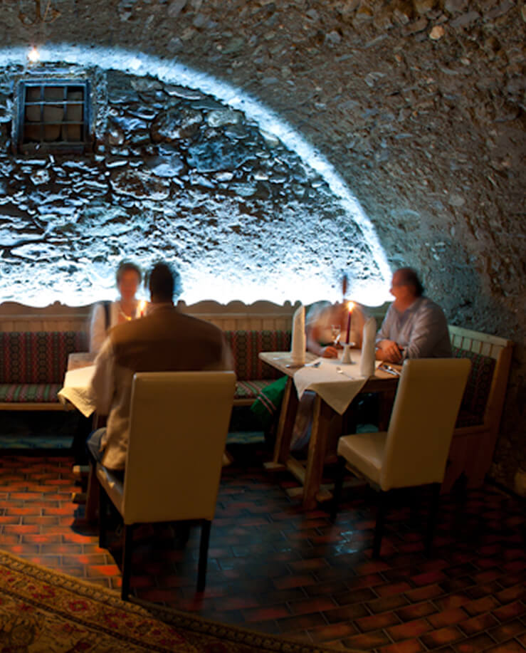 Where old walls tell stories, one thing cannot be missing: our house ghost. He is said to have once been a knight – perhaps one of the guardians of Kaprun Castle who sought refuge in the Mitteregger via the secret passage. Today, the passage is bricked up, but behind the stone wall in the old vaulted cellar, you can still sense his presence. Our knight ghost is not a restless spectre, quite the contrary: he is friendly, humorous and loves good company. As long as the wine flows and the schnapps doesn’t run out, he remains cheerful and good-natured. It is said that he watches over our house, ensures good spirits and that the Mitteregger always remains lively – as it has done for centuries. Anyone sitting in our cellar, between the old stone walls and the quiet crackling of history, may even feel him – this witty breath of the past that makes our inn so special – and has done so for over 600 years.